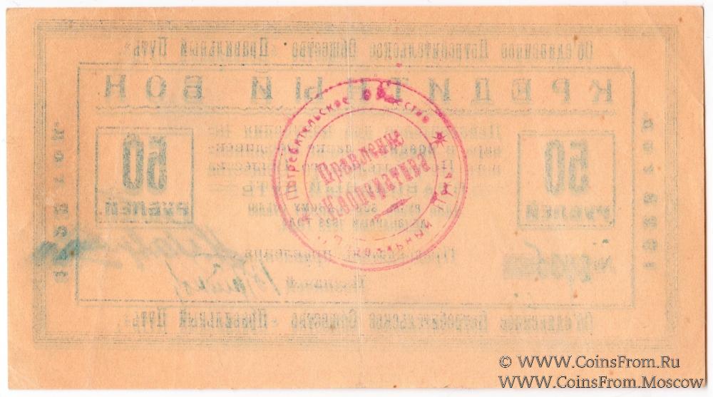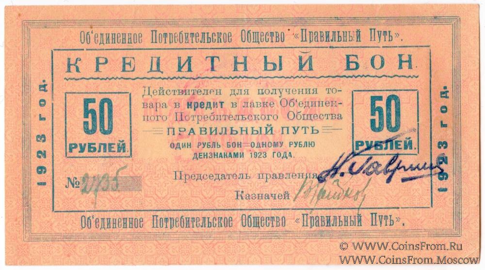 Кредитный бон. Шрифт голубой. Печать на реверсе. Объединенное потребительское общество "Правильный путь".