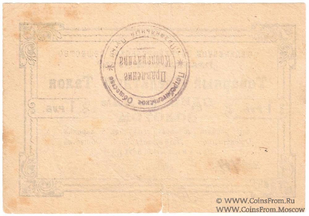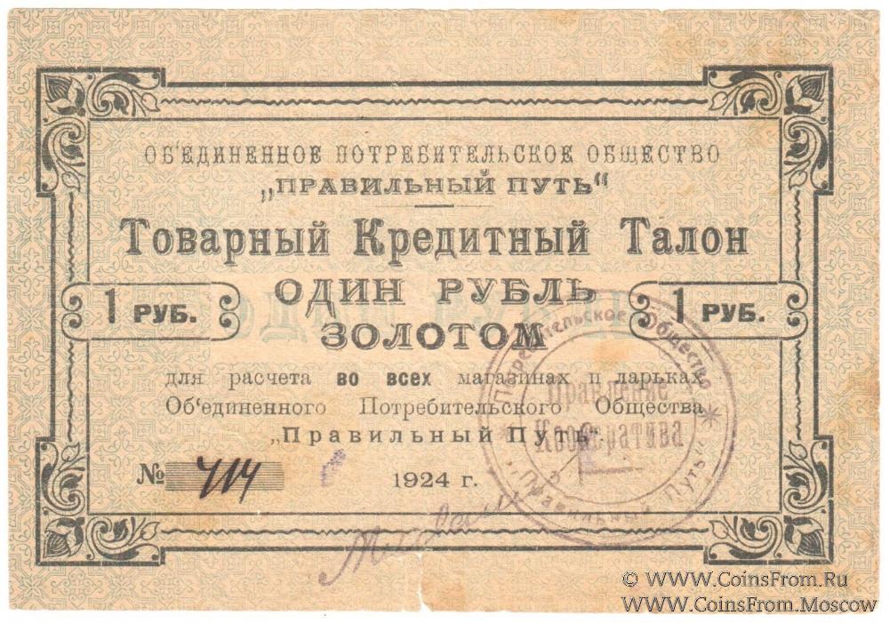 Товарный кредитный талон (золотом). Печать на реверсе. Подпись под цвет печати - фиолетовая. Объединенное потребительское общество "Правильный путь".