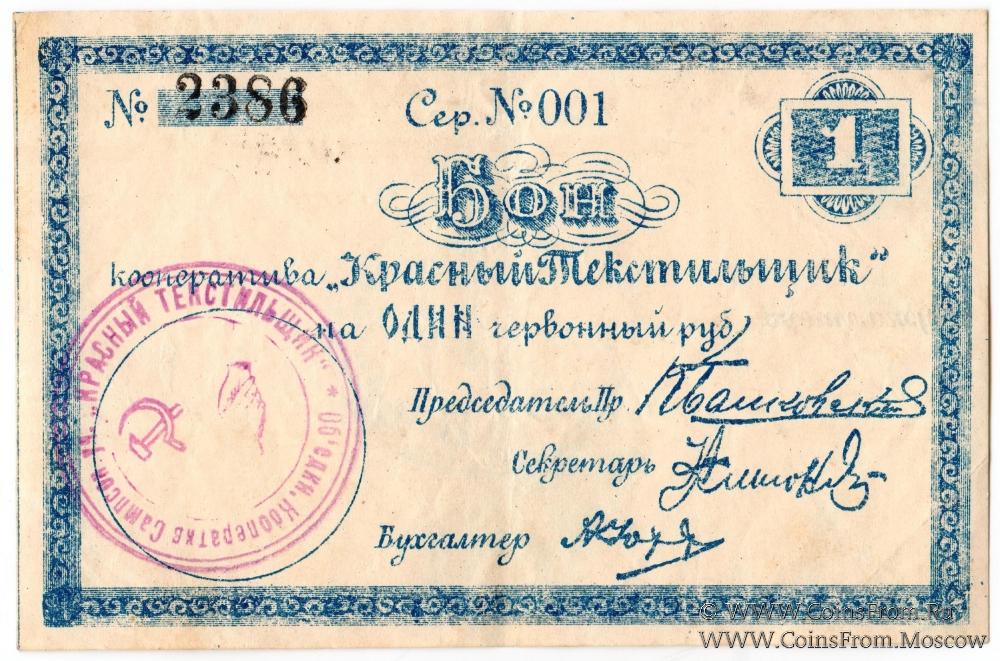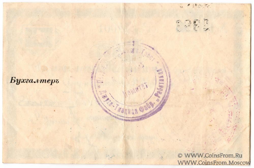 Печать на аверсе Кооператива "Красный текстильщик". Печать на реверсе Фабрики "Работница". Вторичное использование (на реверсе надпечатка "Бухгалтеръ").