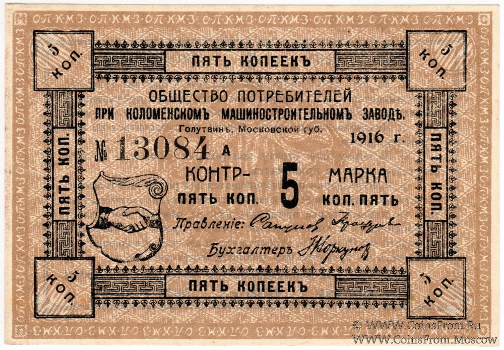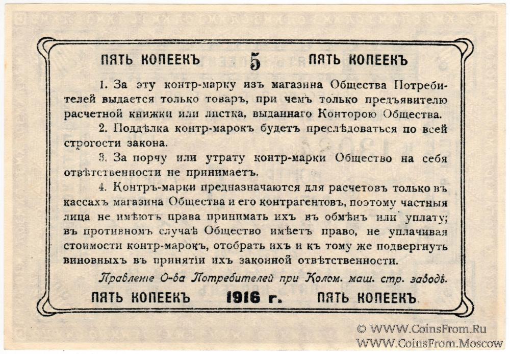 Контрольная марка 1916 г. Водяной знак - "вертикальные волны". Общество потребителей при Коломенском машиностроительном заводе (ОПКМЗ).
