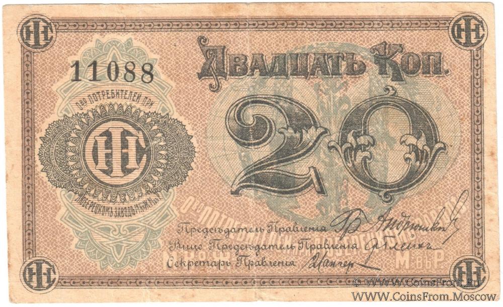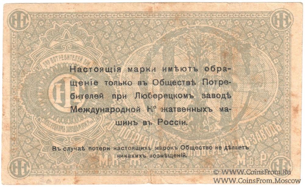 Марка без даты. Текст и виньетка черные. Общество потребителей при заводе Международной Ко жатвенных машин в России.
