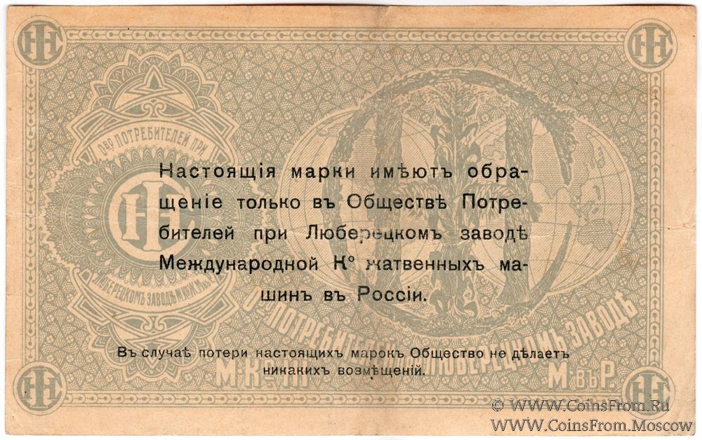 Марка без даты. Текст и виньетка чёрные. Общество потребителей при заводе Международной Ко жатвенных машин в России.