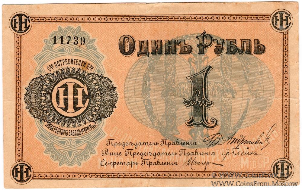 Марка без даты. Текст и виньетка чёрные. Общество потребителей при заводе Международной Ко жатвенных машин в России.