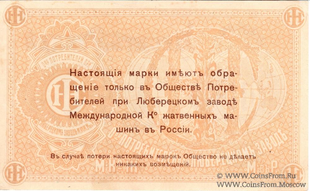Марка без даты. Текст и виньетка фиолетовые. Общество потребителей при заводе Международной Ко жатвенных машин в России.