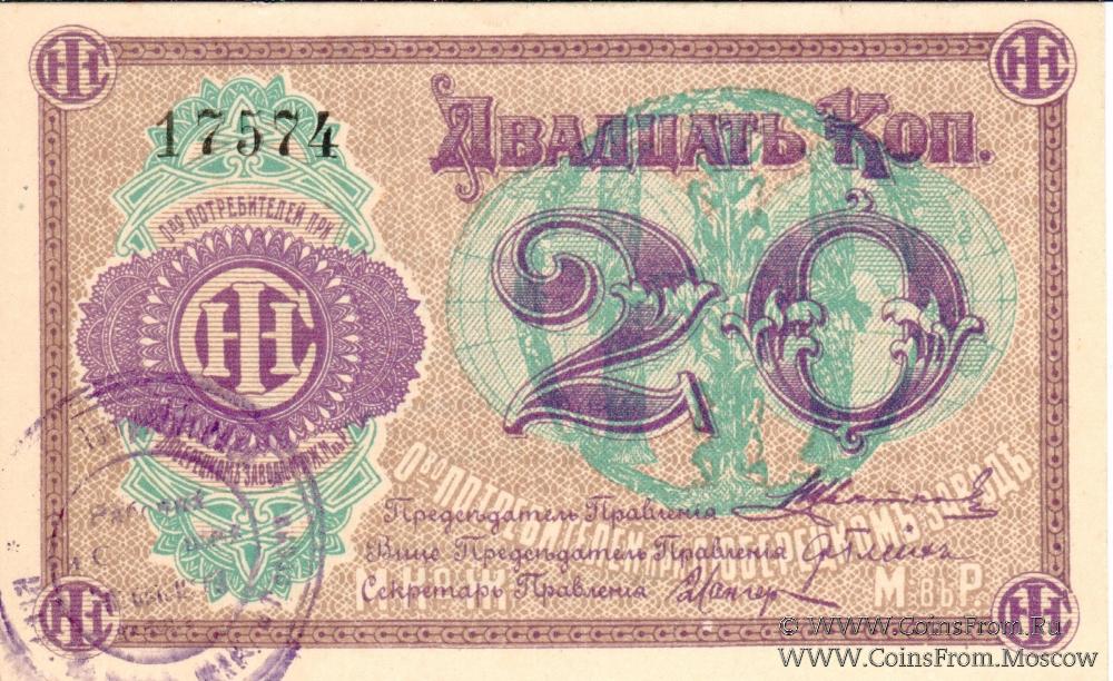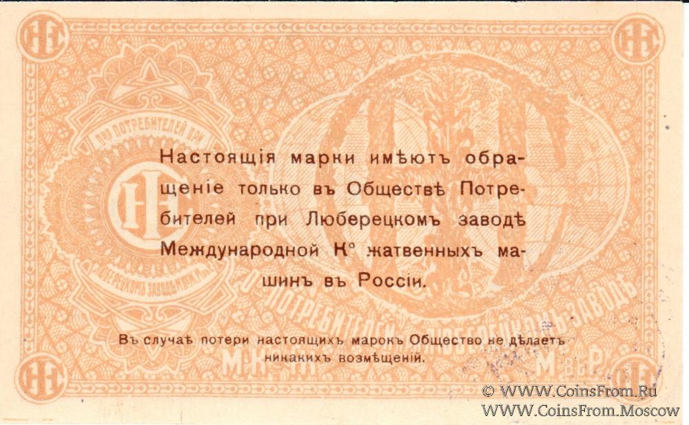 Марка без даты. Текст и виньетка фиолетовые. Печать на аверсе. Общество потребителей при заводе Международной Ко жатвенных машин в России.