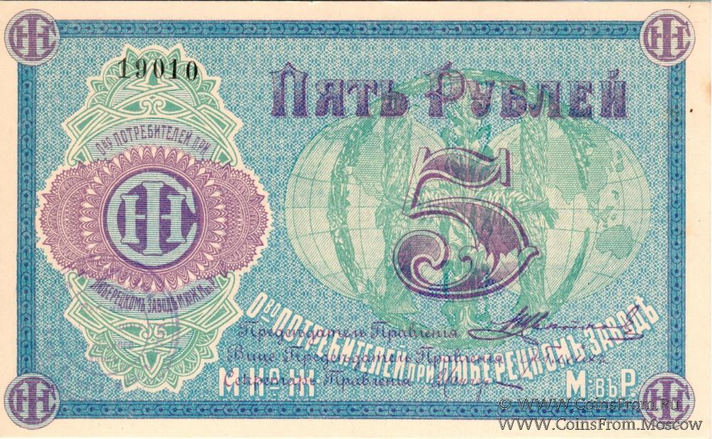 Марка без даты. Текст и виньетка фиолетовые. Общество потребителей при заводе Международной Ко жатвенных машин в России.