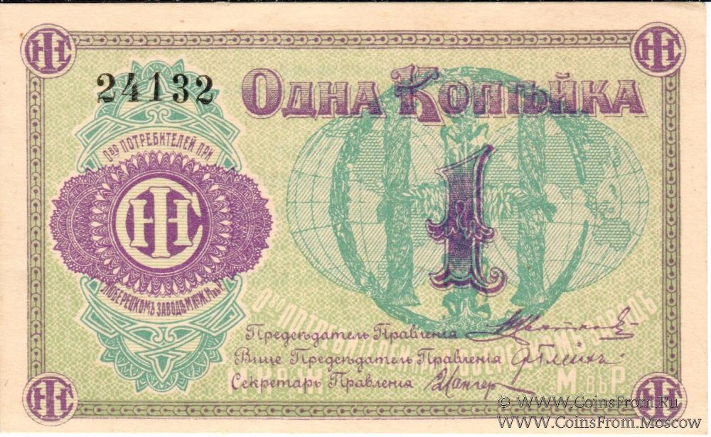 Марка без даты. Текст и виньетка фиолетовые. БРАК: реверс перевернут. Общество потребителей при заводе Международной Ко жатвенных машин в России.