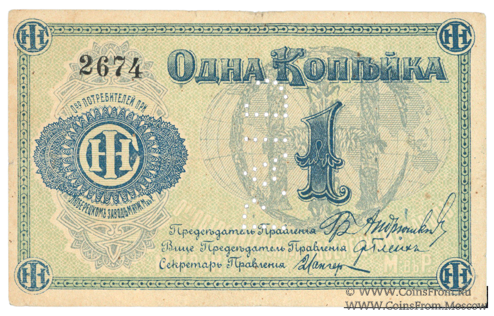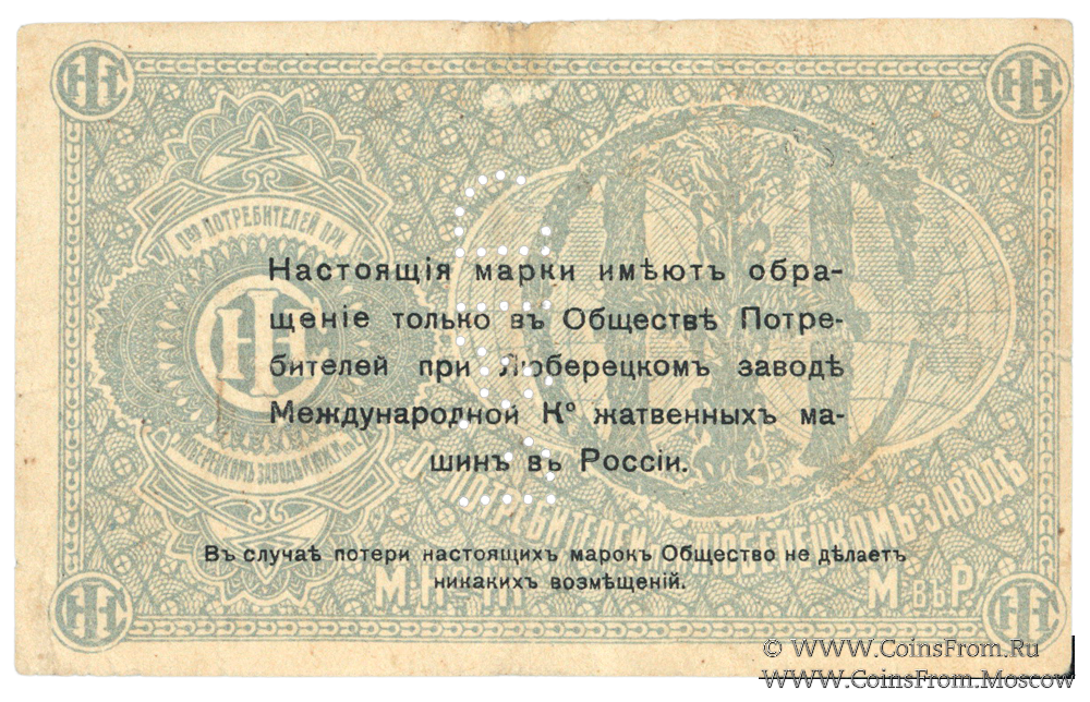 Марка без даты. Текст и виньетка синие. Гашение перфорацией "PAID". Общество потребителей при заводе Международной Ко жатвенных машин в России.