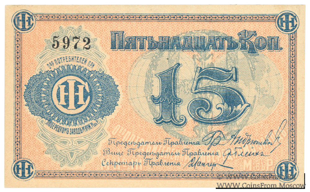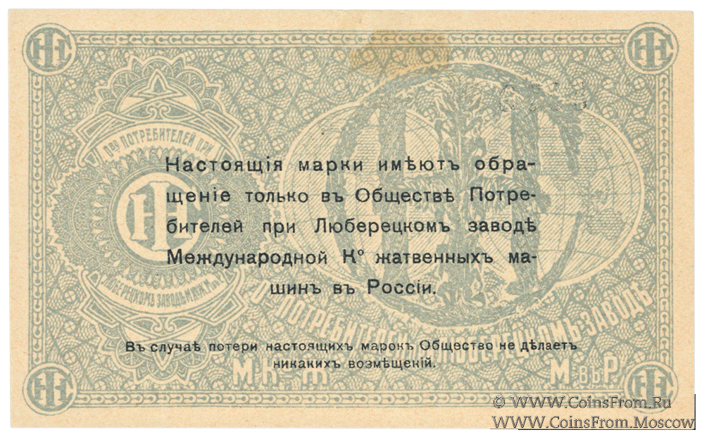 Марка без даты. Текст и виньетка синие. Общество потребителей при заводе Международной Ко жатвенных машин в России.