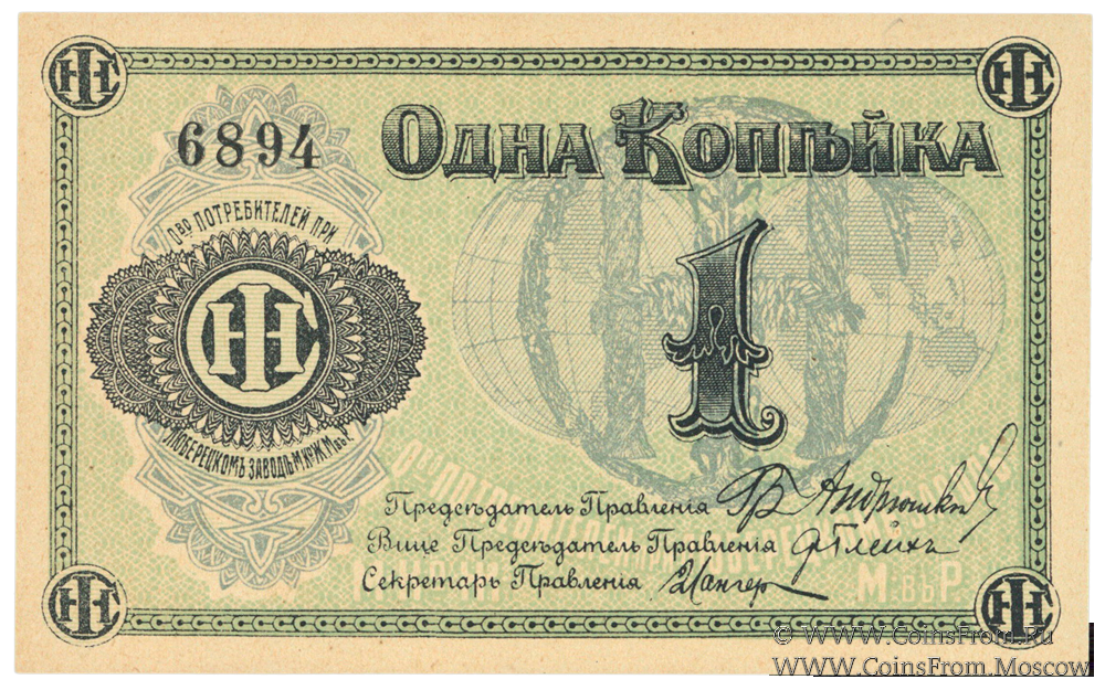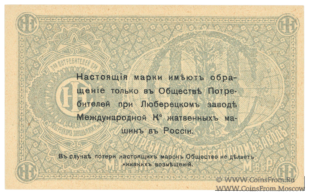 Марка без даты. Текст и виньетка черные. Номер 4-значный. Общество потребителей при заводе Международной Ко жатвенных машин в России.