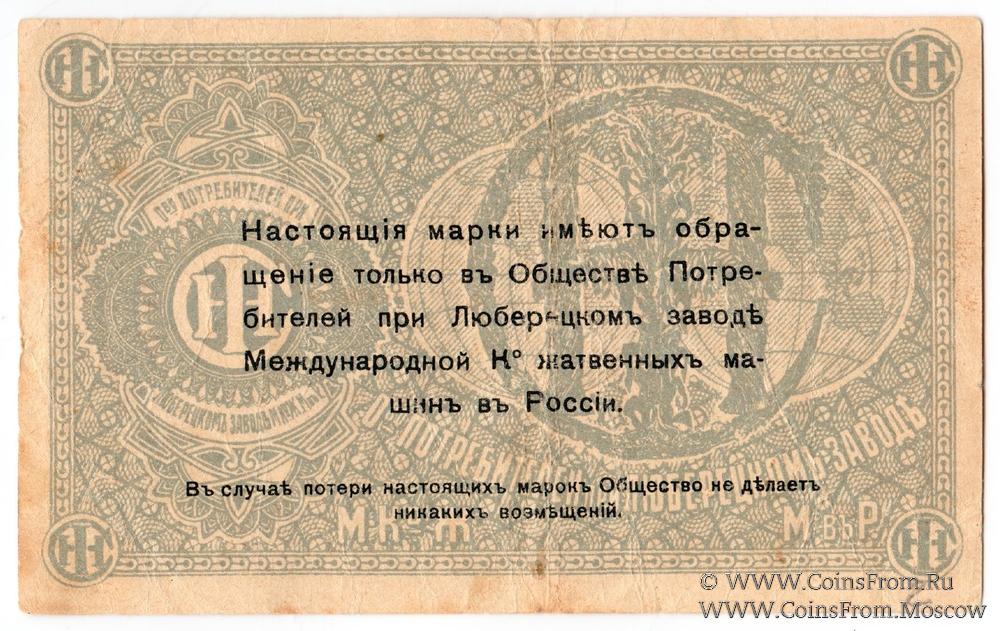 Марка без даты. Текст и виньетка чёрные. Общество потребителей при заводе Международной Ко жатвенных машин в России.