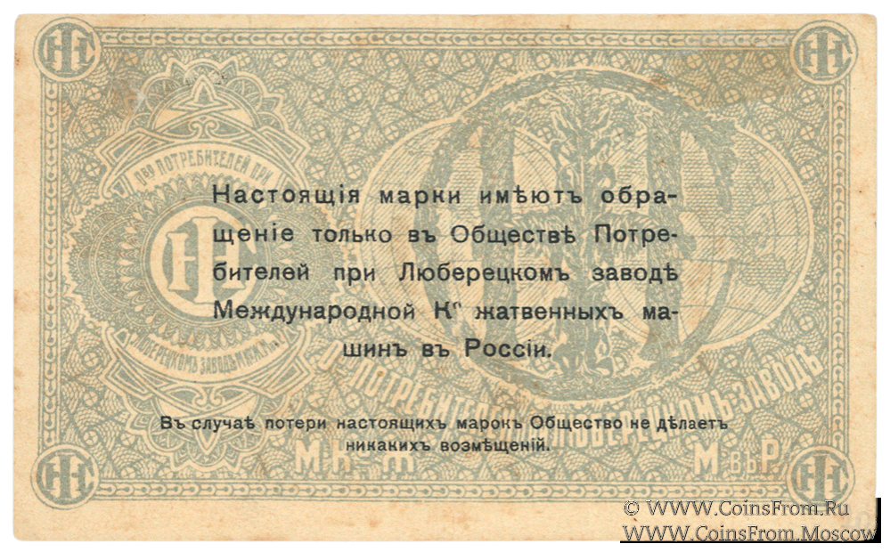 Марка без даты. Текст и виньетка черные. Общество потребителей при заводе Международной Ко жатвенных машин в России.