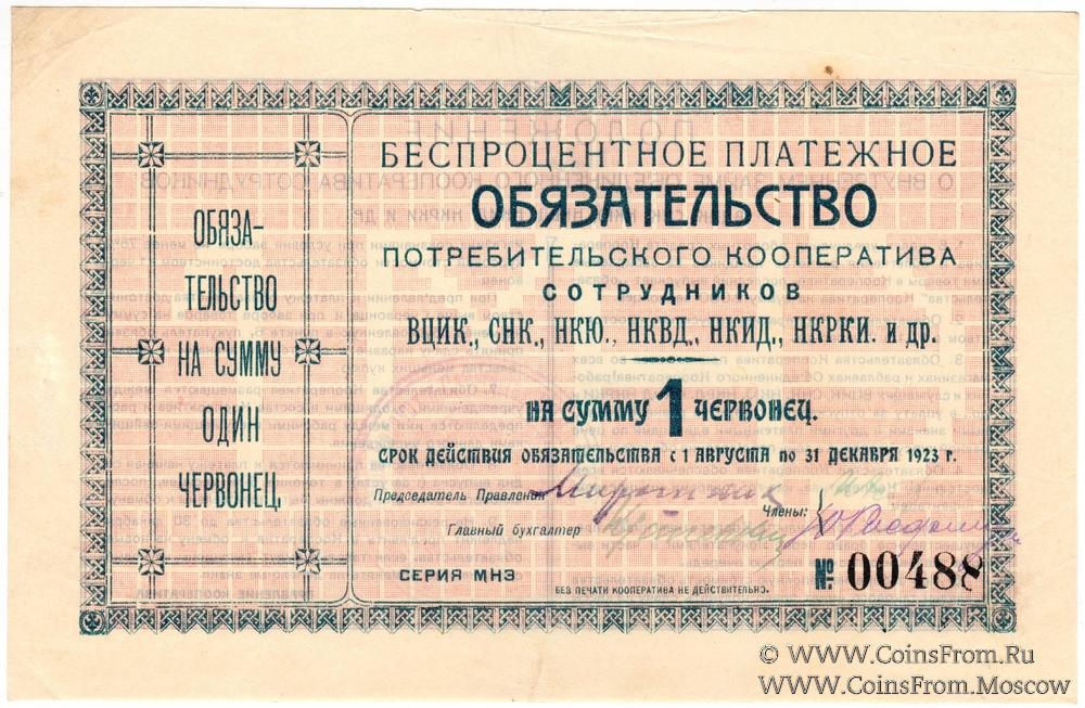 Беспроцентное платежное обязательство. Потребительский кооператив сотрудниковм ВЦИК, СНК, НКЮ, НКВД, НКИД, НКРКИ и др.