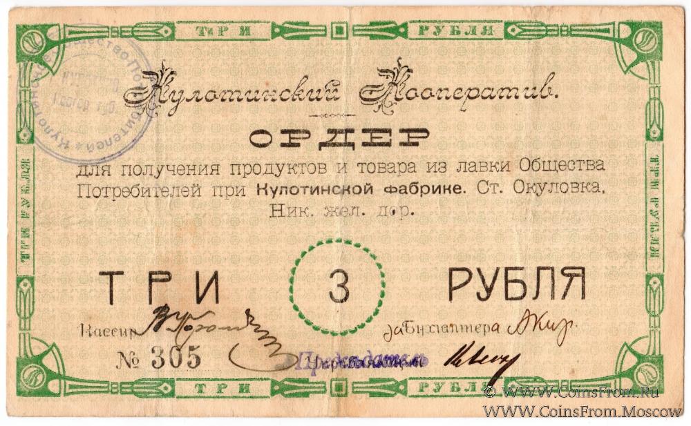 Ордер без даты (1919 г.). Общество Потребителей при Кулотинской фабрике.