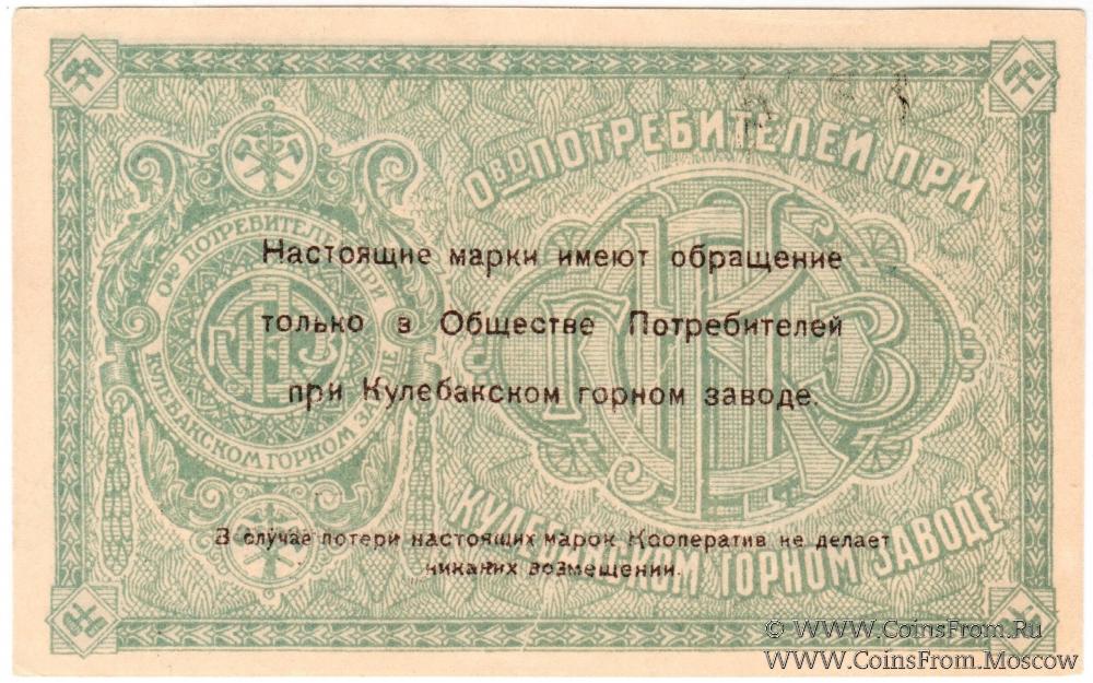 Марка без даты. Номер 5-значный. Общество потребителей при Кулебакском горном заводе.