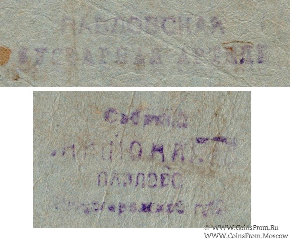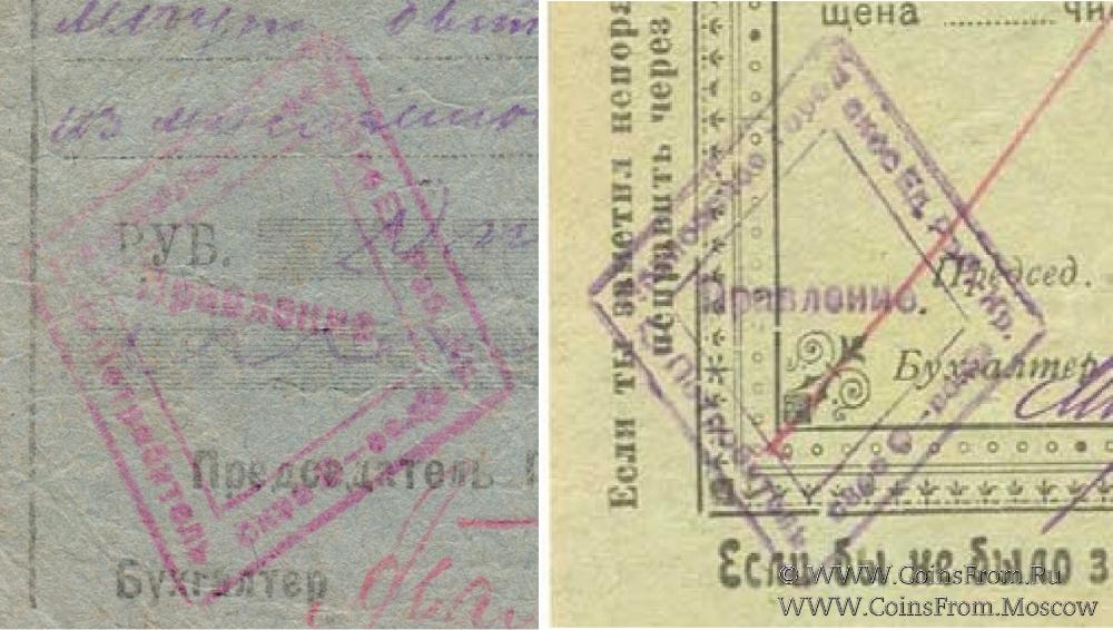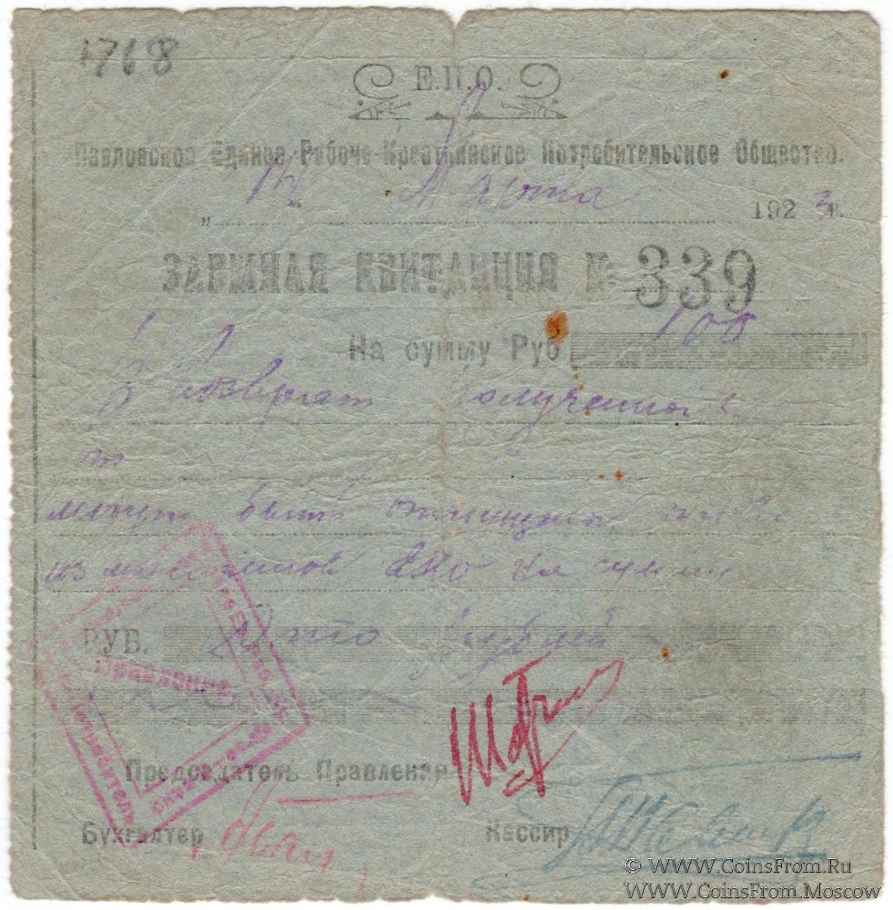 Заемная квитанция. Печать правления на аверсе. Два штампа на реверсе. Павловское единое рабоче-крестьянское потребительское общество.
