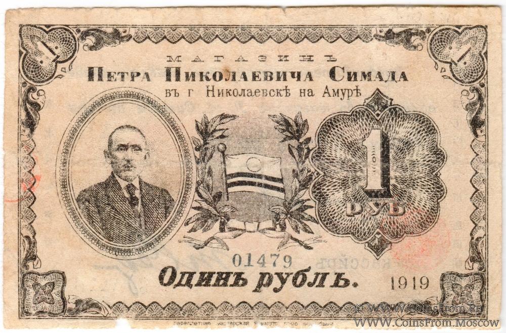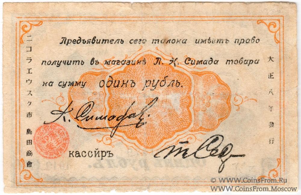 Талон. С опечаткой в отчестве (Пиколаевич). На реверсе круглая красная печать на японском. Магазин Петра Николаевича Симада в Николаевске на Амуре.