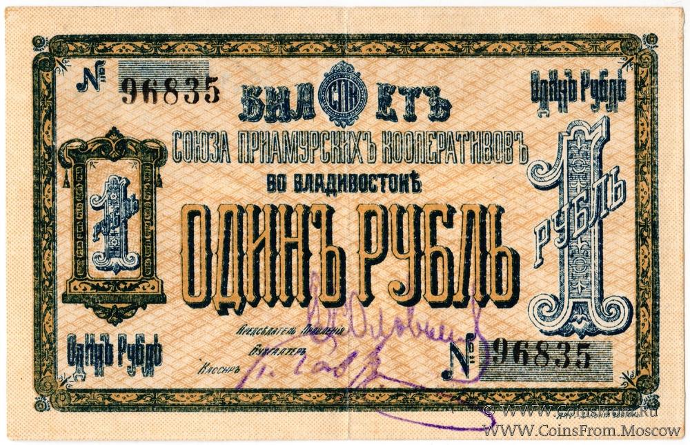1 руб Владивосток Союз приамурских кооп № 96835 РВ