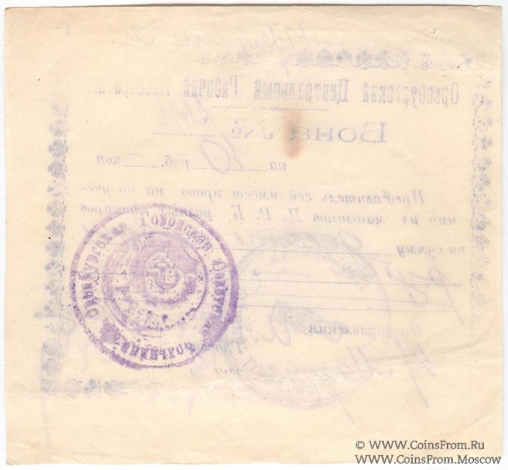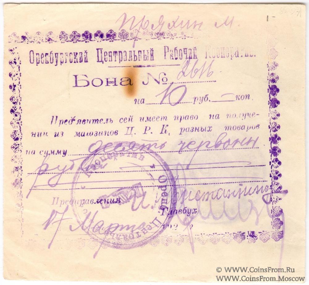 Бона 1923-1924 гг. Дата: "17 марта 1924 г". Бумага белая. На реверсе печать. Оренбургский Центральный Рабочий Кооператив.