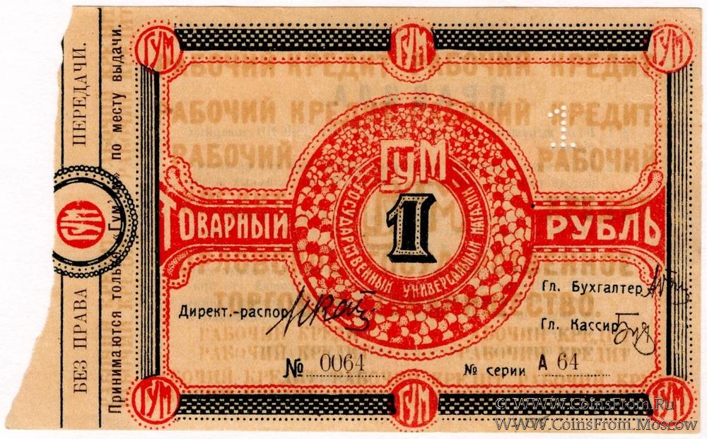 Бона (без права передачи) без даты (1921 г.). В товарных рублях. Принимаются только ГУМом по месту выдачи. ГУМ - Государственный универсальный магазин.