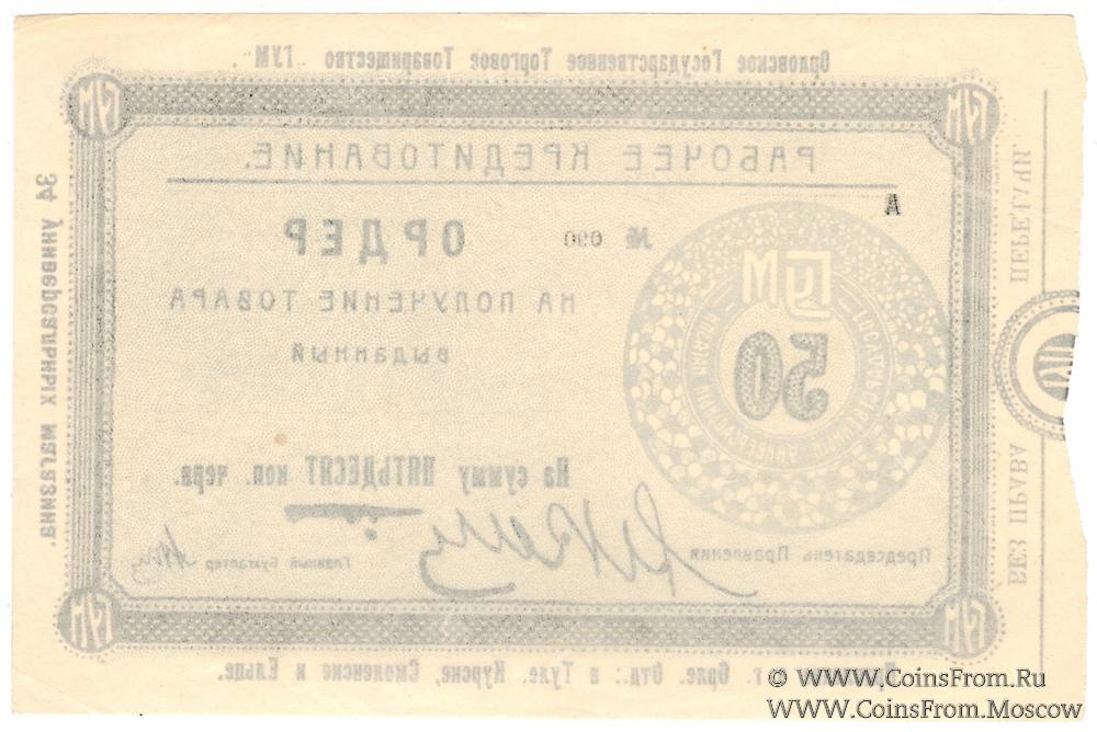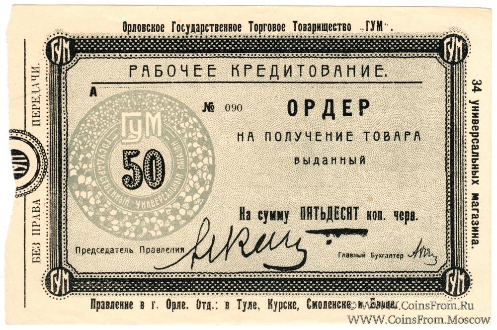 Ордер на получение товара (без права передачи) без даты (1923 г.). В червонных копейках. Бланк. Орловское Государственное Торговое Товарищество "ГУМ".