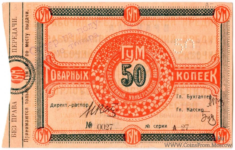 Бона (без права передачи) без даты (1921 г.). В товарных копейках. Вариант 2 - надпечатка (штамп) на аверсе. Принимаются только ГУМом по месту выдачи. ГУМ - Государственный универсальный магазин.