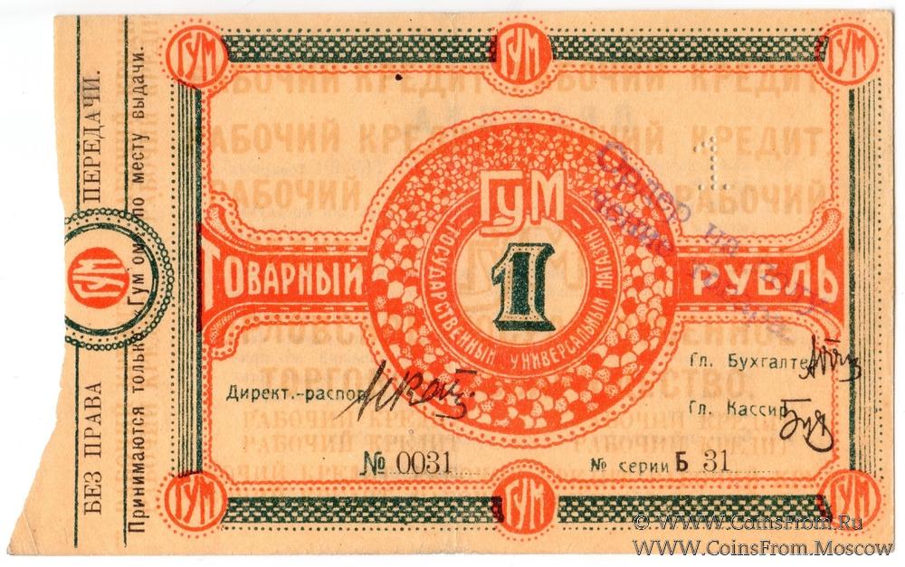 Бона (без права передачи) без даты (1921 г.). В товарных рублях. Вариант 2 - надпечатка (штамп) на аверсе. Принимаются только ГУМом по месту выдачи. ГУМ - Государственный универсальный магазин.