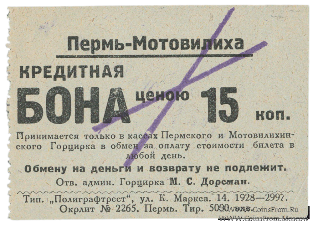 15 копеек 1928 г. (Пермь - Мотовилиха)