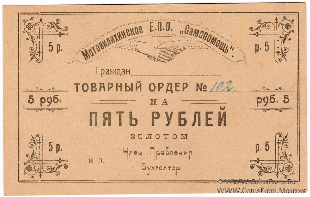 Товарный ордер золотом без даты (1923 г.). Мотовилихское Единое Общество Потребителей "САМОПОМОЩЬ".