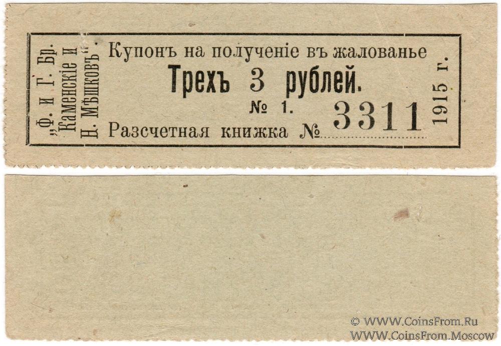 Купон на получение в жалованье. Зубцовка с 2-х сторон. Расчетная книжка № 3311. Ф. и Г. братья Каменские и Н. Мешков.