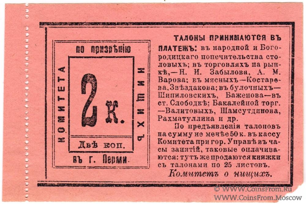 Талон без даты. Комитет по призрению нищих в г. Перми.