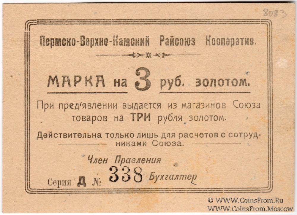 Марка без даты (1923 г.) в рублях золотом. Серия Д. Пермско-Верхне-Камский Райсоюз Кооперативов.