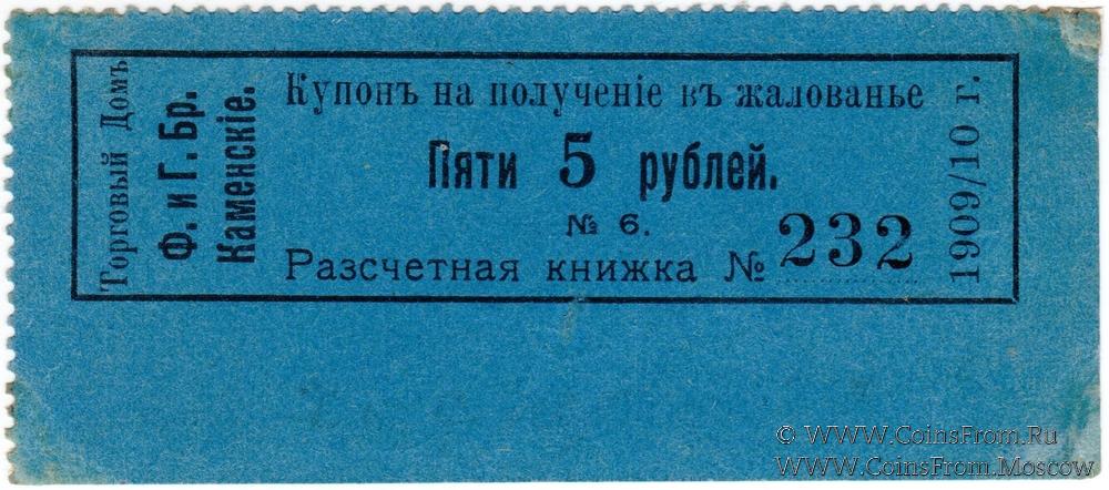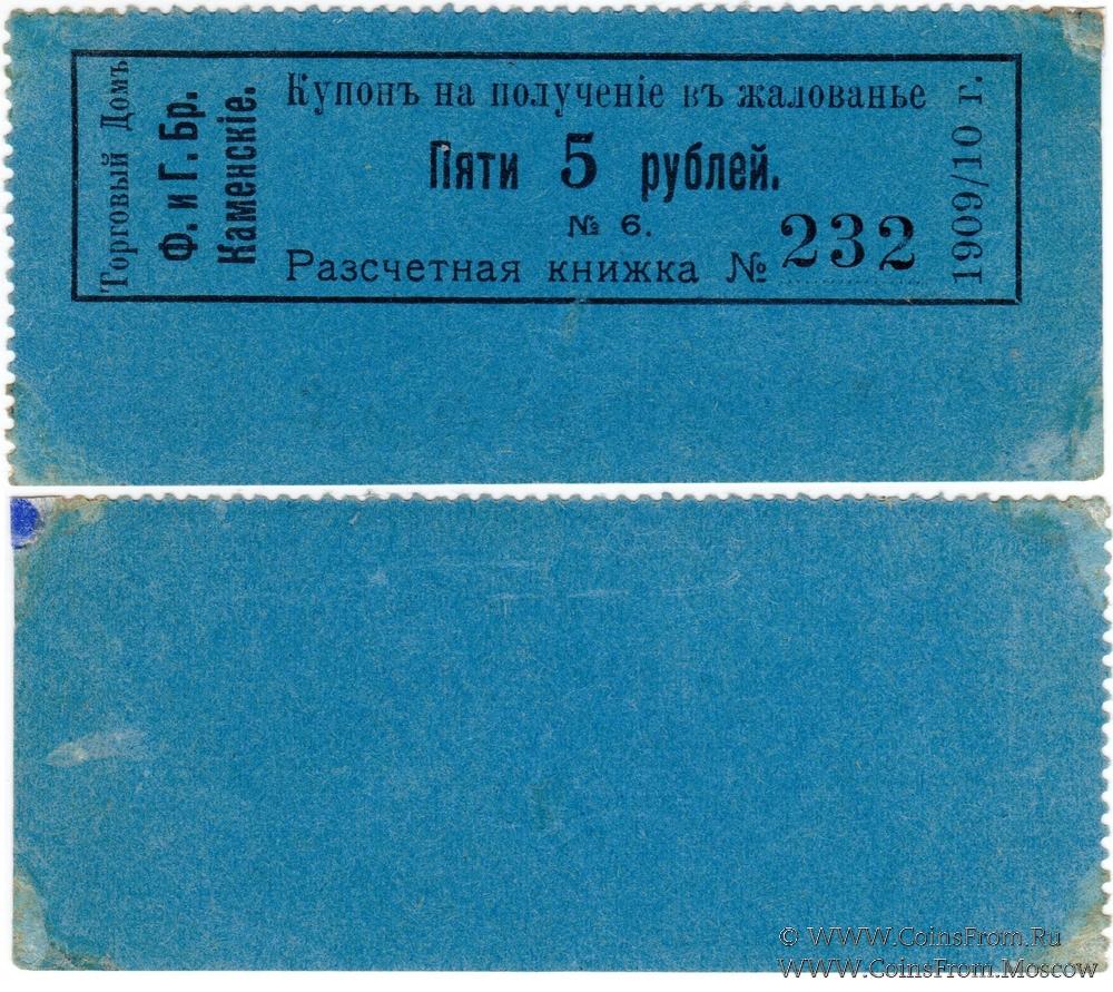 Купон на получение в жалованье. Расчетная книжка № 232. Цифры номера меньше. Торговый дом Ф. и Г. братья Каменские.