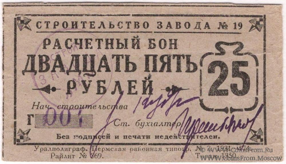 Расчетный бон. Серия Г (серые). Строительство завода №19. ПЕРМСТРОЙ.