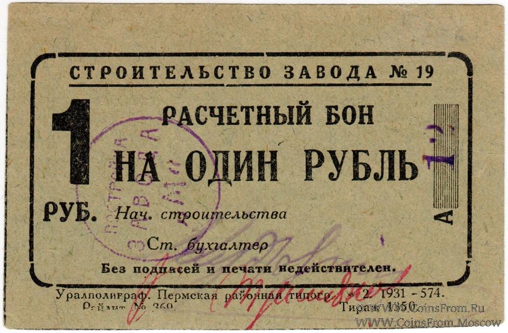 Расчетный бон. Серия А (зеленые). Строительство завода №19. ПЕРМСТРОЙ.