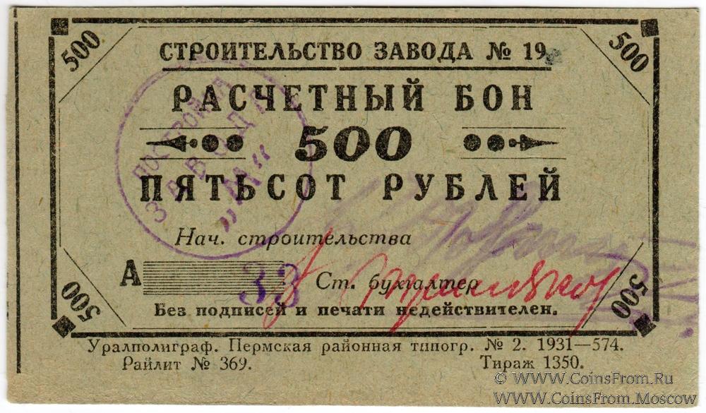 Расчетный бон. Серия А (зеленые). Строительство завода №19. ПЕРМСТРОЙ.