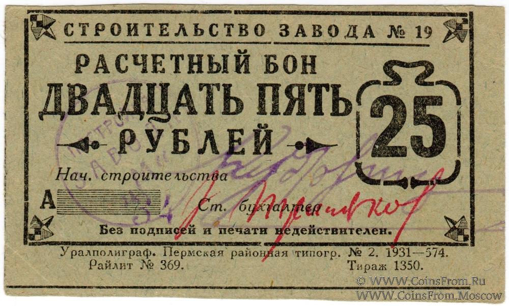 Расчетный бон. Серия А (зеленые). Строительство завода №19. ПЕРМСТРОЙ.