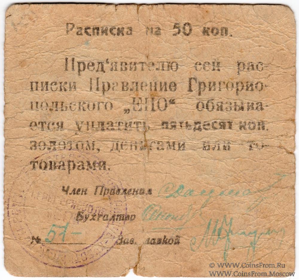 Печать круглая: "Г.ГРИГОРИОПОЛЯ "ЕПО"" (по центру в две строки) / "ЕДИНОЕ РАБОЧЕ-КРЕСТЬЯНСК. ПОТРЕБИТ. ОБЩЕСТВО *" (по кругу).