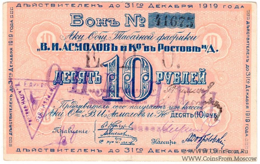 Бон Акционерного Общества Табачной фабрики "В.И. Асмолов и Ко".