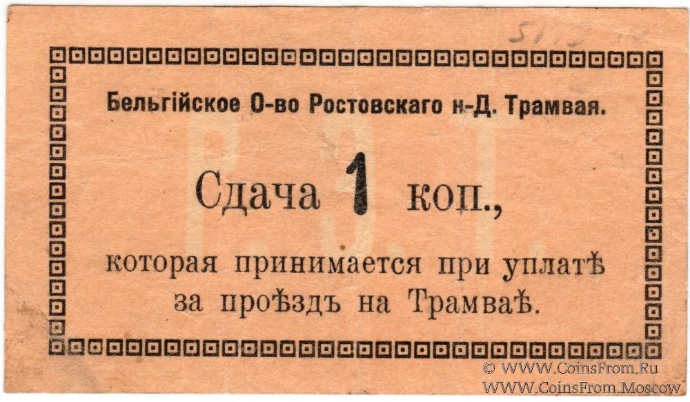 Печать на реверсе. Цифра "1" - округлая. Сдача, которая принимается при оплате за проезд на Трамвае. Бельгийское Общество Ростовского НД Трамвая.