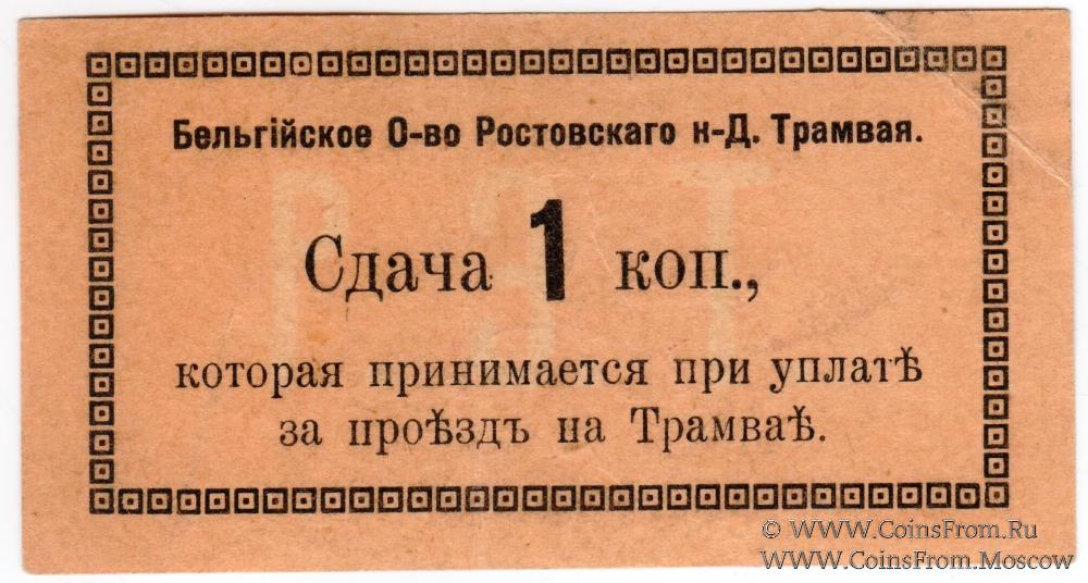 Печать на реверсе. Цифра "1" - прямая. Сдача, которая принимается при оплате за проезд на Трамвае. Бельгийское Общество Ростовского НД Трамвая.