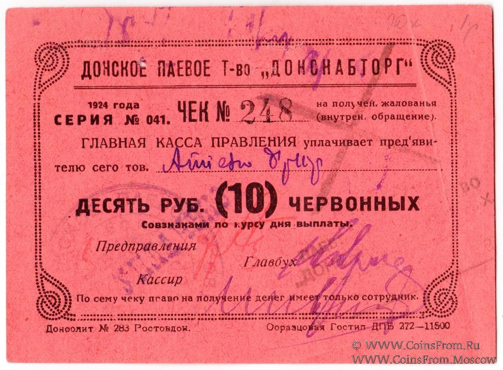 Чек 1924 г. в червонных рублях. Печать и штамп фиолетового цвета. Гашение штампом. Номер 3-значный. Донское Паевое Товарищество "ДОНСНАБТОРГ" Д.С.Н.Х.