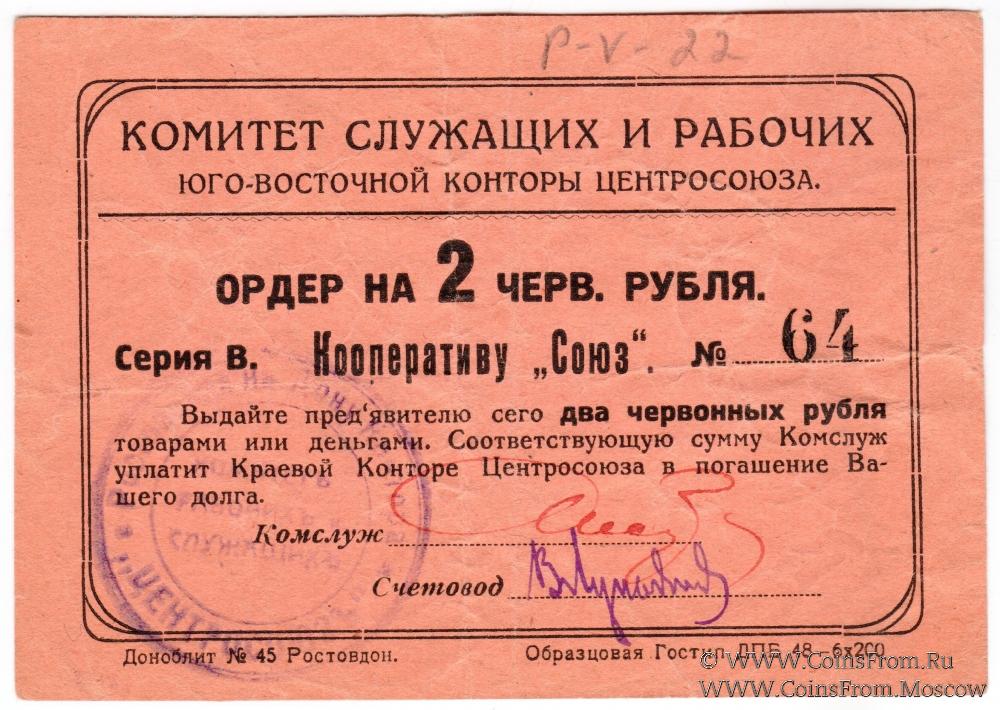 Ордер 1924 г. в червонных рублях. Комитет служащих и рабочих Юго-восточной конторы Центросоюза.