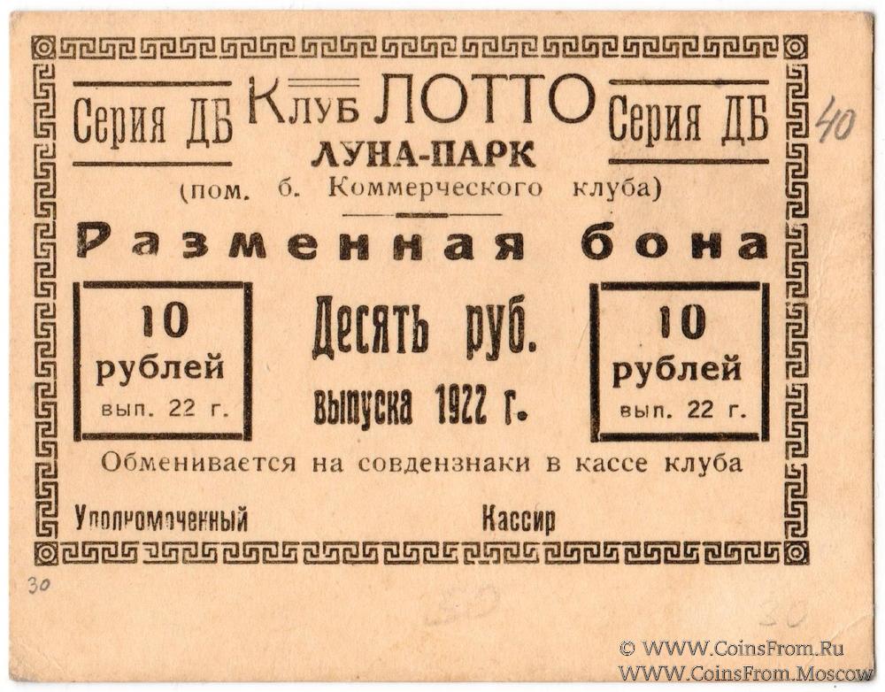 Разменная бона. Клуб-лотто "Луна-Парк".