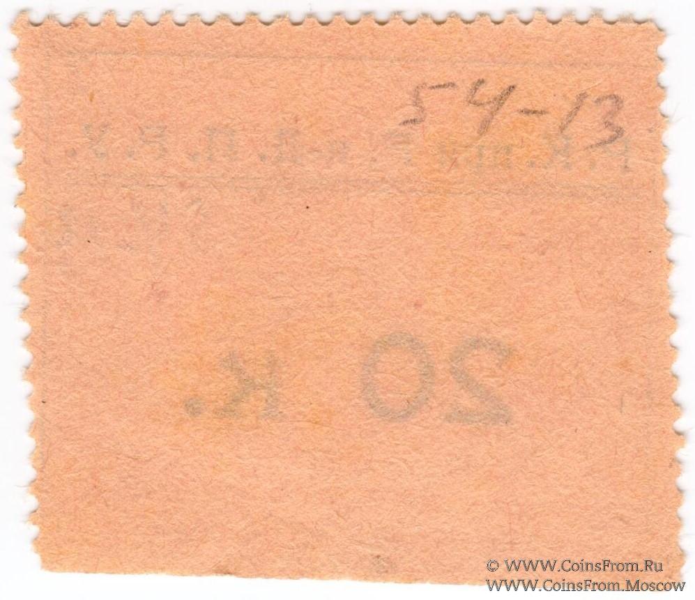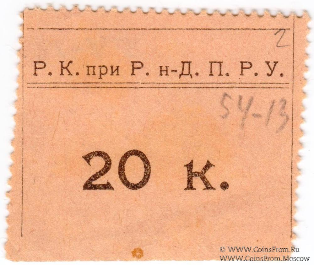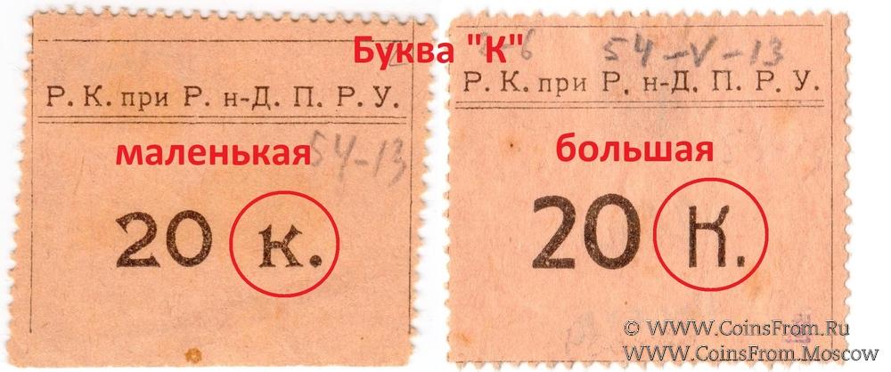 Буква "к" маленькая. Шрифт номинала "20 к" фигурный (с гастами). Р.К. при Р.н-Д. П.Р.У. (Родительский Комитет при Ростовском-на-Дону Петровском реальном училище).