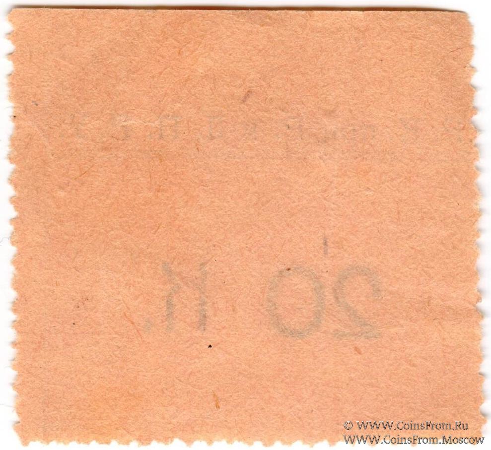 Буква "к" большая. Цифры номинала "20" узкие и низкие. Перфорация с 3-х сторон.