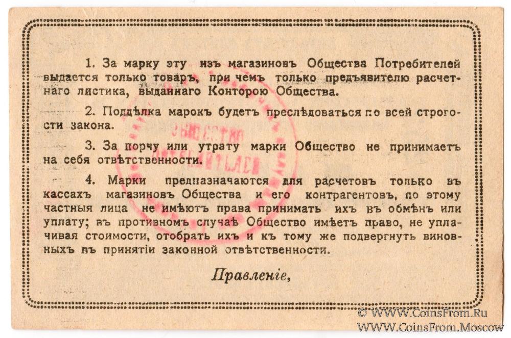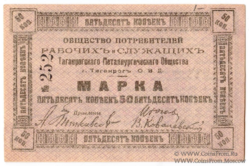 Печать круглая: "ОБЩЕСТВО / ПОТРЕБИТЕЛЕЙ" (по центру в две строки) / "Таганрогсное Металлург. О-во Рабочихъ и Служащихъ * " (по кругу).