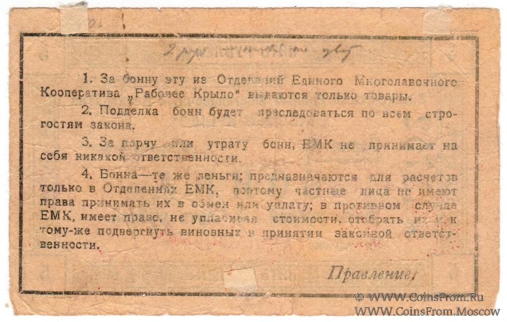 Бона без даты (1919 г.). Серия Д. С оттиском печати и факсимиле подписей ответственных лиц. Единый Многолавочный Кооператив "Рабочее крыло".