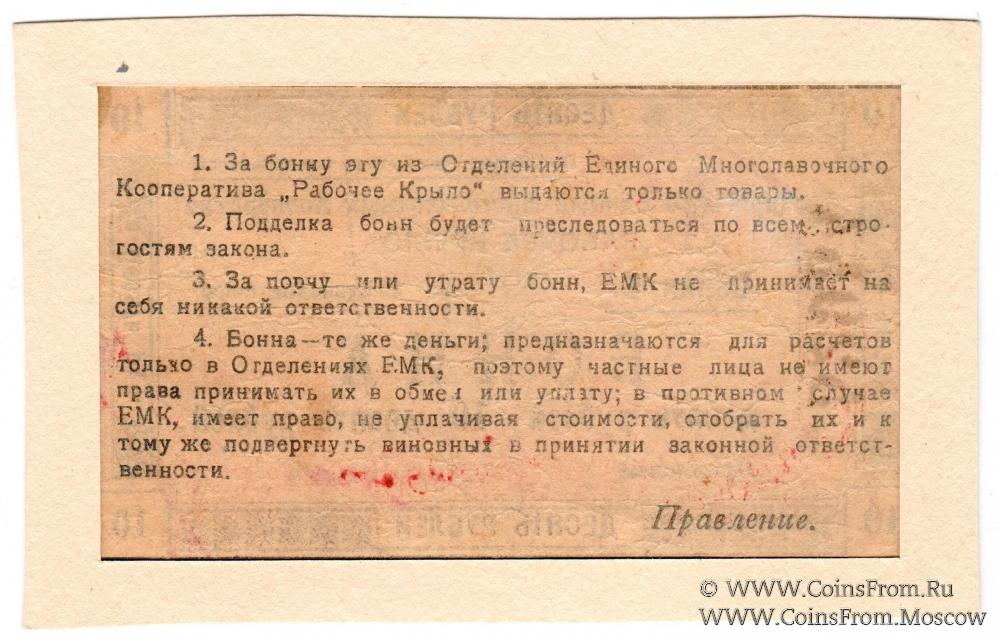 Бона без даты (1919 г.). Серия Е. С оттиском печати и факсимиле подписей ответственных лиц. Единый Многолавочный Кооператив "Рабочее крыло".