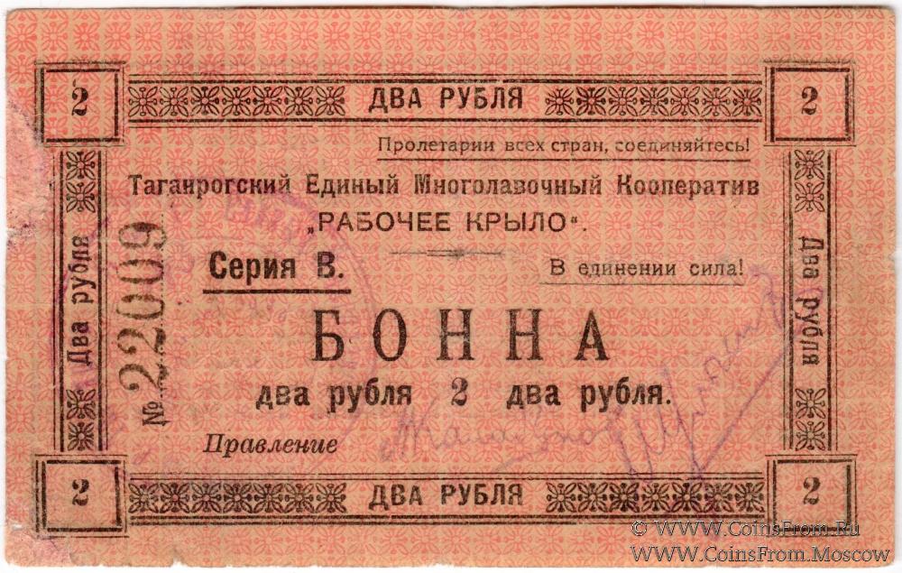 Бонна без даты (1919 г.). Серия В. С оттиском печати и факсимиле подписей ответственных лиц. Единый Многолавочный Кооператив "Рабочее крыло".